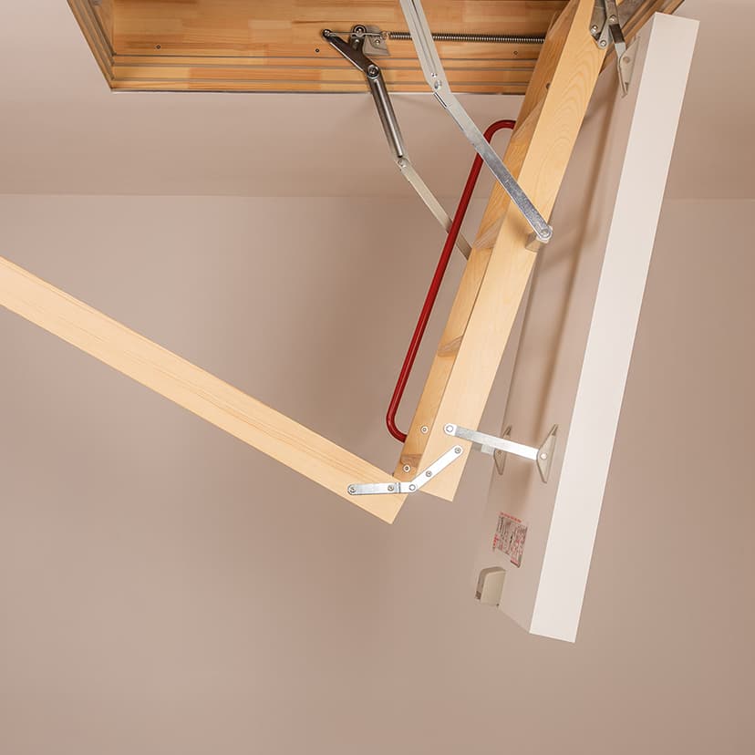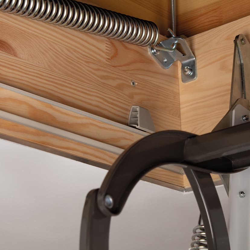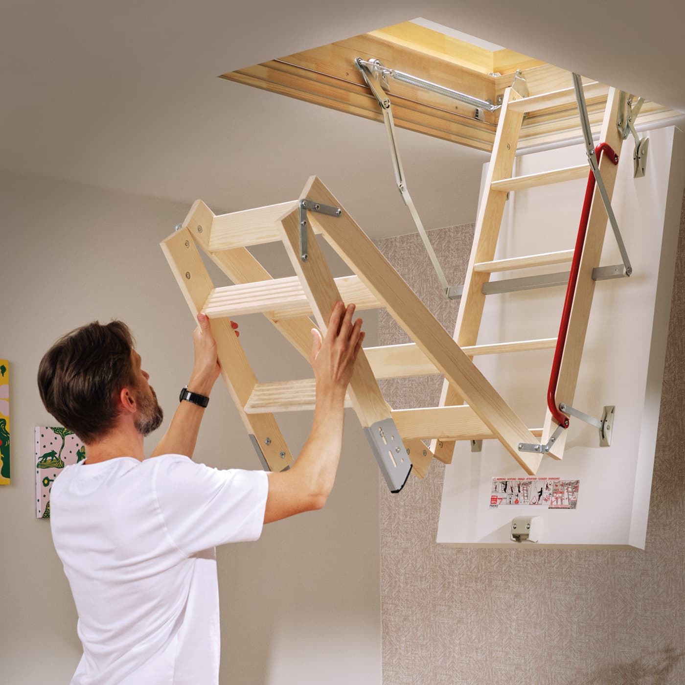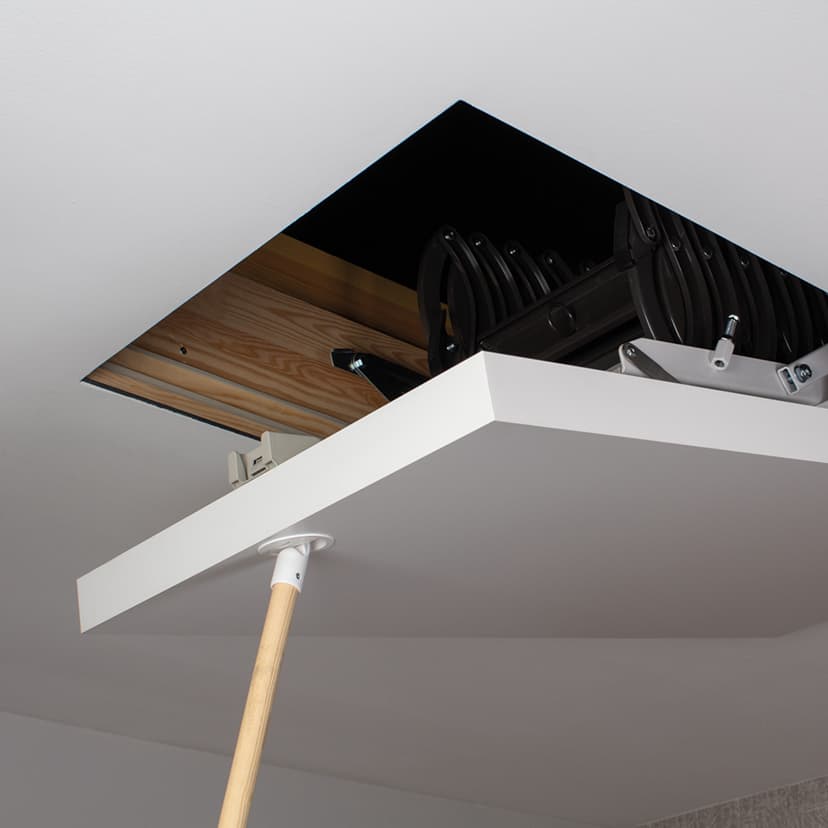 Intuicyjna obsługa sprawia, że korzystanie ze schodów jest szybkie i wygodne. Wystarczy użyć drążka i lekko pociągnąć, aby po rozłożeniu drabinki schody były gotowe do użycia.