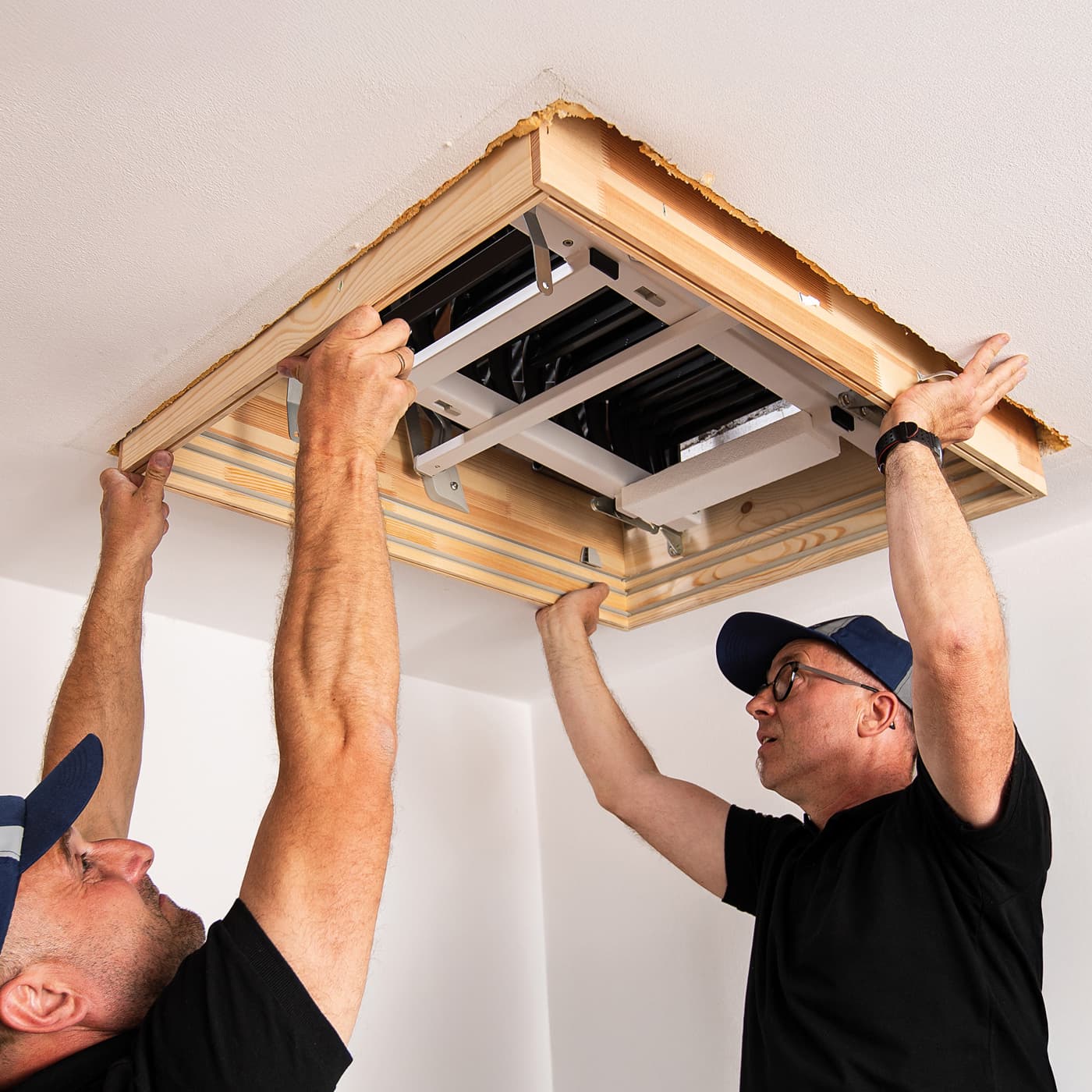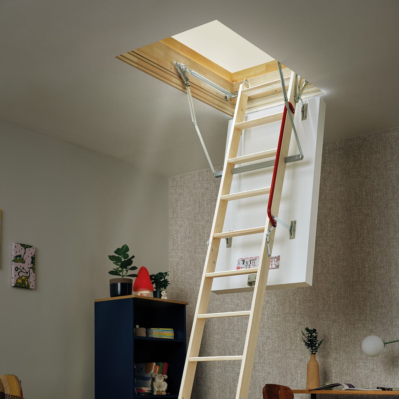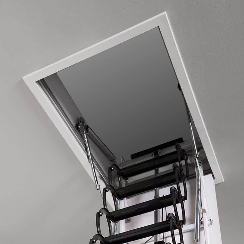 Intuicyjna obsługa sprawia, że korzystanie ze schodów jest szybkie i wygodne. Wystarczy użyć drążka i lekko pociągnąć, aby po rozłożeniu drabinki schody były gotowe do użycia.