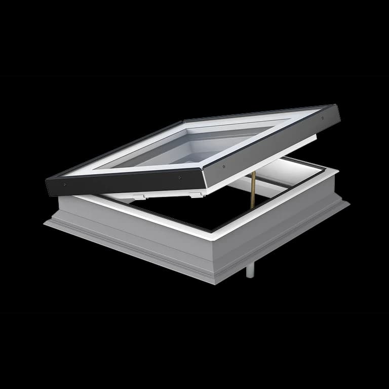Otwierane ręcznie okno DMG P2 przeznaczone jest do montażu na dachach płaskich o kącie nachylenia od 2° do 15°, 5° do 15° lub od 0° przy zastosowaniu ramy XRD/A zwiększającej kąt montażu. Opcjonalne podstawy montażowe XRD i XRD/W pozwalają osadzić okno także na dachach zielonych, żwirowych czy wentylowanych, zapewniając elastyczność w aranżacji. Czarny zewnętrzny profil aluminiowy oraz uniwersalne wykończenie wewnętrzne w kolorze białym sprawia, że produkt harmonijnie komponuje się z różnymi stylami architektury, tworząc spójną i elegancką całość.