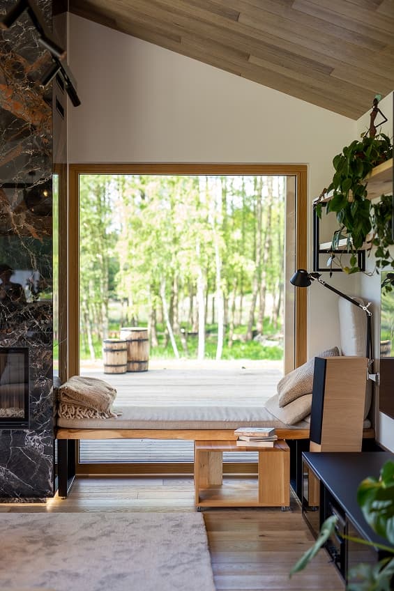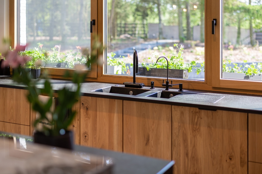 W domach zintegrowanych z krajobrazem szczególną rolę odgrywa spójność materiałów. Drewno, kamień i beton powracają w różnych strefach – zarówno zewnętrznych, jak i wewnętrznych – tworząc wizualną harmonię. Stolarka INNOVIEW idealnie wpisuje się w ten porządek. System Modern 78, z dębowym profilem wykończonym w bezbarwnym macie, jest zlicowany z profilem ramy okiennej, tworząc wizualnie jednolitą płaszczyznę z wyraźnie zaznaczonym rantem centralnym. Od strony wnętrza zastosowano profil Regular – prosty, nowoczesny, który dopełnia koncepcję architektoniczną bez jej zakłócania. Czarne okładziny aluminiowe (RAL 9005 FS) podkreślają współczesny charakter bryły, nie dominując nad naturalnymi fakturami.
