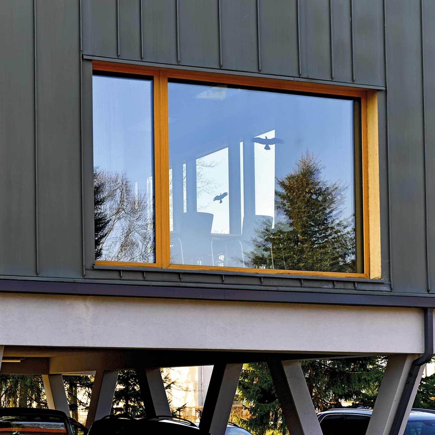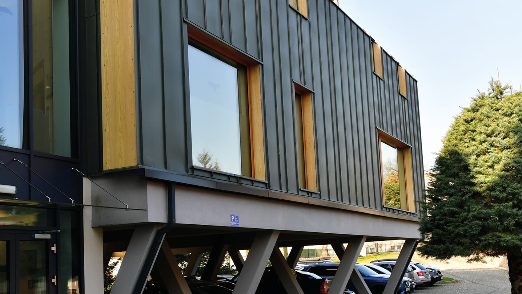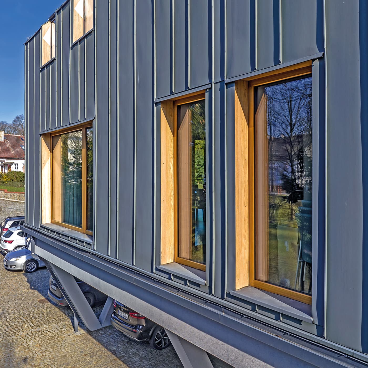 Warty zauważenia jest kolor oblachowania. Okładzina aluminiowa wykończona została w strukturze drewnopodobnej AD-06-MAT, która imituje drewniane usłojenie. Wyróżnia to okna na tle całego budynku, nadając im wyrazisty akcent w bryle budynku. Wewnątrz zastosowano równie charakterystyczny odcień – sosna została pokryta lazurową powłoką w kolorze BROWN, co podkreśla indywidualny charakter wnętrza.