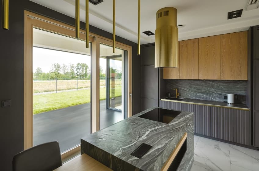Ważnym tematem projektowym są przeszklenia. Zastosowanie wielkoformatowych okien i drzwi FAKRO INNOVIEW Modern 78 pozwoliło stworzyć wrażenie nieustannego kontaktu z krajobrazem. Ten nowoczesny system drewniano-aluminiowy, z charakterystycznym zlicowaniem skrzydła z ramą i ukrytymi zawiasami, idealnie odpowiada na potrzeby współczesnych projektów mieszkaniowych, które poszukują spójności między estetyką, energooszczędnością i trwałością. W budynku zastosowano konstrukcje rozwierno-uchylne, drzwi balkonowe, przesuwne wielkoformatowe drzwi HST oraz szklenia stałe. Dzięki temu każda elewacja pozostaje otwarta – nie tylko wizualnie, ale i funkcjonalnie. Przestrzenie dzienne płynnie przechodzą w tarasy, a elementy stolarki nie dominują, lecz organizują relacje między światłem, wnętrzem i otoczeniem.