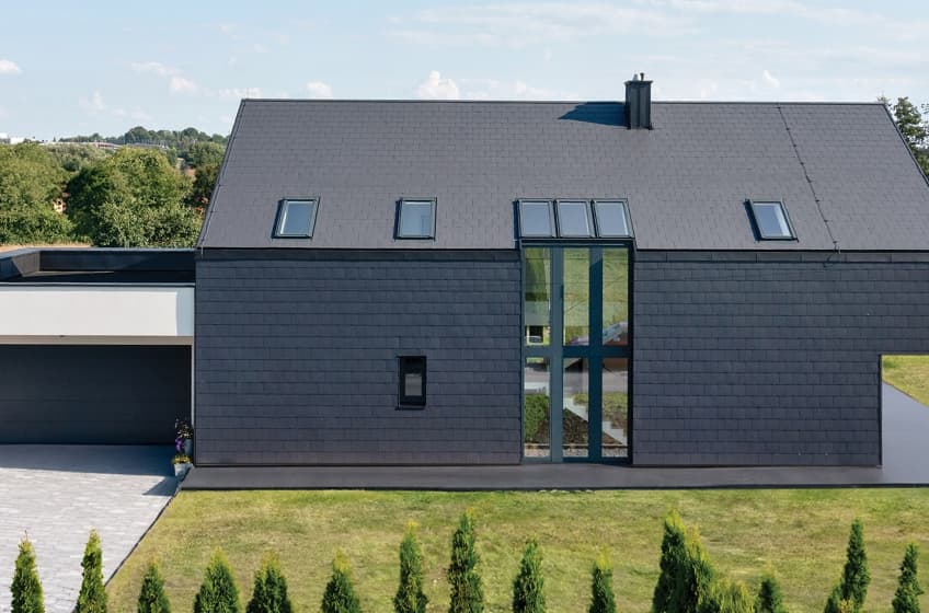 Ten dom to przykład pełnej integracji rozwiązań FAKRO – zarówno w elewacji, jak i w połaci dachu. Oprócz stolarki fasadowej INNOVIEW, zastosowano tu również okna dachowe FAKRO, dzięki którym światło naturalne przenika także do strefy poddasza. Szczególną cechą tej realizacji jest sposób wykonania zespolenia: połączenie fasady i połaci zostało poprowadzone od samego poziomu gruntu, co w praktyce oznacza imponującą, pionową kompozycję przeszkleń przechodzącą przez dwie kondygnacje. To rozwiązanie spotykane niezwykle rzadko – w typowych projektach elementy stolarki pionowej nie przekraczają 1000 mm wysokości. Tu – stanowią integralną oś kompozycyjną bryły, łącząc światło, widok i architekturę w jedną spójną całość.