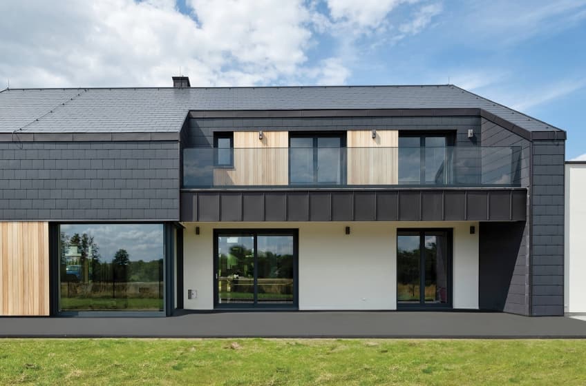 Bryła budynku to czysta forma zamknięta w zdecydowanej geometrii. Brak okapów, jednolite pokrycie dachu i elewacji ciemnym materiałem w odcieniu antracytowym (RAL 7016 FS), a także wyraziste linie konstrukcyjne tworzą spójny, monolityczny efekt. Drewniane akcenty – pionowe panele drewniane w naturalnym kolorze – wprowadzają równowagę i przytulność, kontrastując z surową geometrią. Elewacja żyje światłem: gra cieni, odbicia i perspektywa tworzą architekturę dynamiczną, zmienną w zależności od pory dnia.