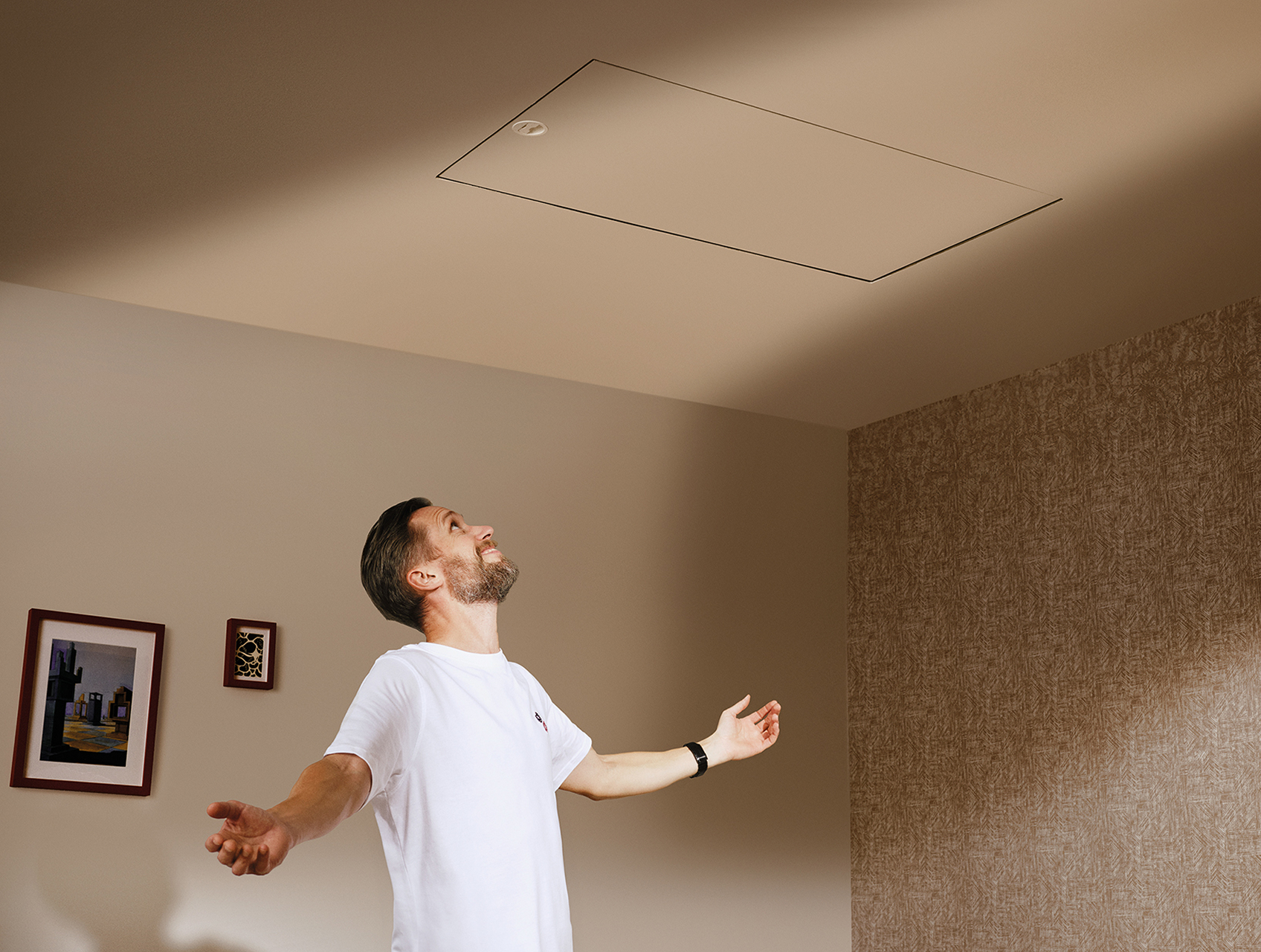 Biała klapa licująca z sufitem, wystająca jedynie 5 mm, oraz dedykowane listwy LXA tworzą spójną, dyskretną całość. Po zamknięciu schody GREENSTEP wtapiają się w sufit i nie zaburzają aranżacji wnętrza.