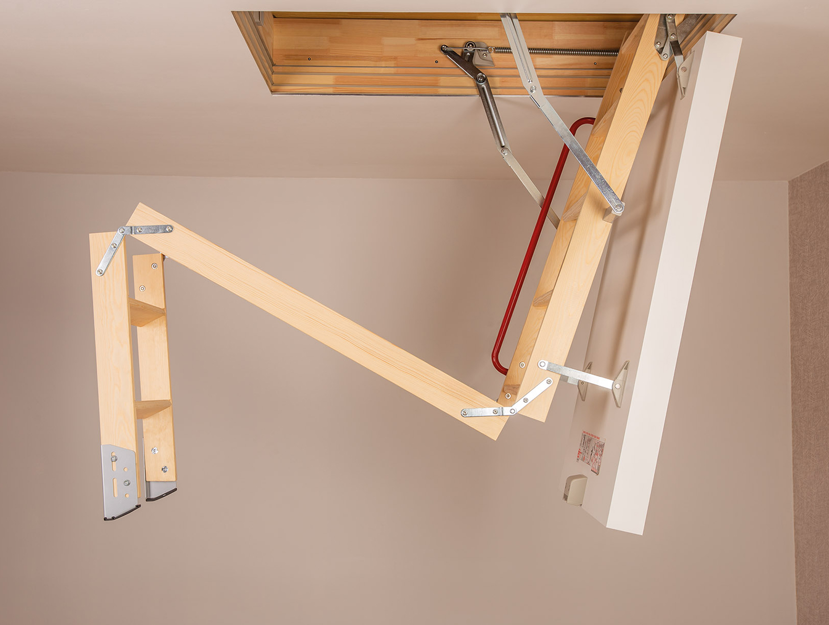 Intuicyjna obsługa sprawia, że korzystanie ze schodów jest szybkie i wygodne. Wystarczy użyć drążka i lekko pociągnąć, aby po rozłożeniu drabinki schody były gotowe do użycia.