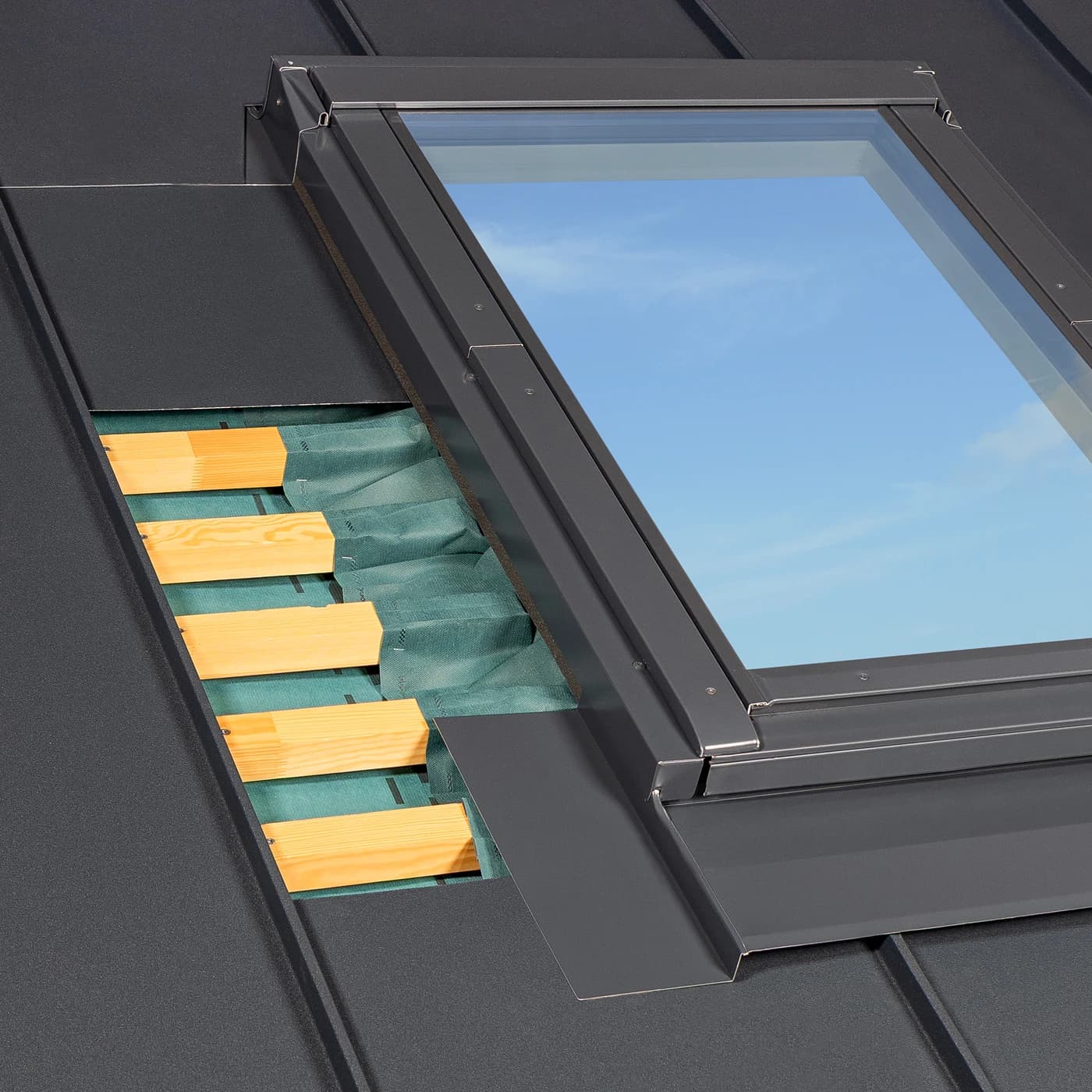 Montaż kołnierza EBV-T Thermo _X00 jest prosty oraz szybki – elementy systemowe precyzyjnie dopasowują się do okna i panelowej blachy dachowej z rąbkiem, co ułatwia pracę dekarza a wykonane z materiału pokrycia obróbki boczne zapewnia wysoką estetykę połączenia. Dzięki takiemu rozwiązaniu ryzyko nieszczelności zostaje zminimalizowane. Kołnierz standardowo przeznaczony jest do montażu pojedynczego okna, dostępny również w wersjach modułowych do zespoleń. Zakres montażu obejmuje dachy o spadku od 15° do 90°, dlatego sprawdzi się w wielu konstrukcjach dachowych.