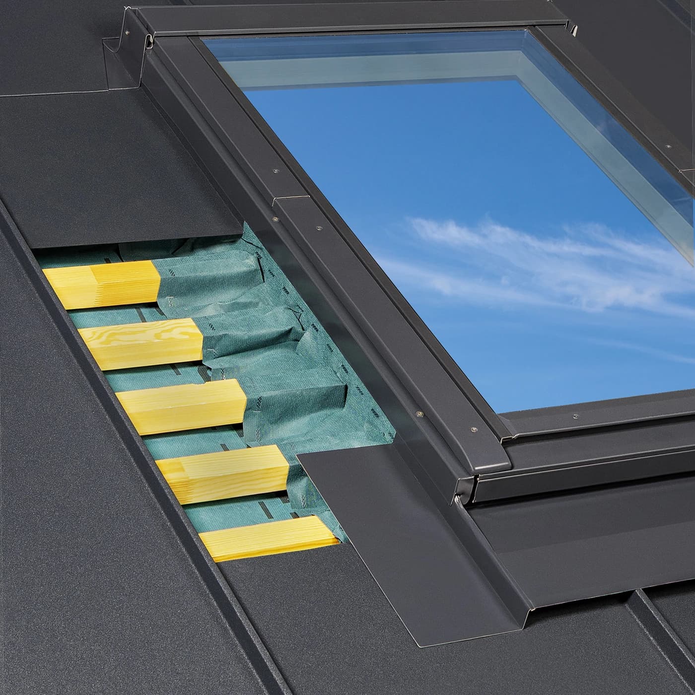 Montaż kołnierza EBV _X00 jest prosty oraz szybki – elementy systemowe precyzyjnie dopasowują się do okna i panelowej blachy dachowej z rąbkiem, co ułatwia pracę dekarza a wykonane z materiału pokrycia obróbki boczne zapewnia wysoką estetykę połączenia. Dzięki takiemu rozwiązaniu ryzyko nieszczelności zostaje zminimalizowane. Kołnierz standardowo przeznaczony jest do montażu pojedynczego okna, dostępny również w wersjach modułowych do zespoleń. Zakres montażu obejmuje dachy o spadku od 15° do 90°, dlatego sprawdzi się w wielu konstrukcjach dachowych.