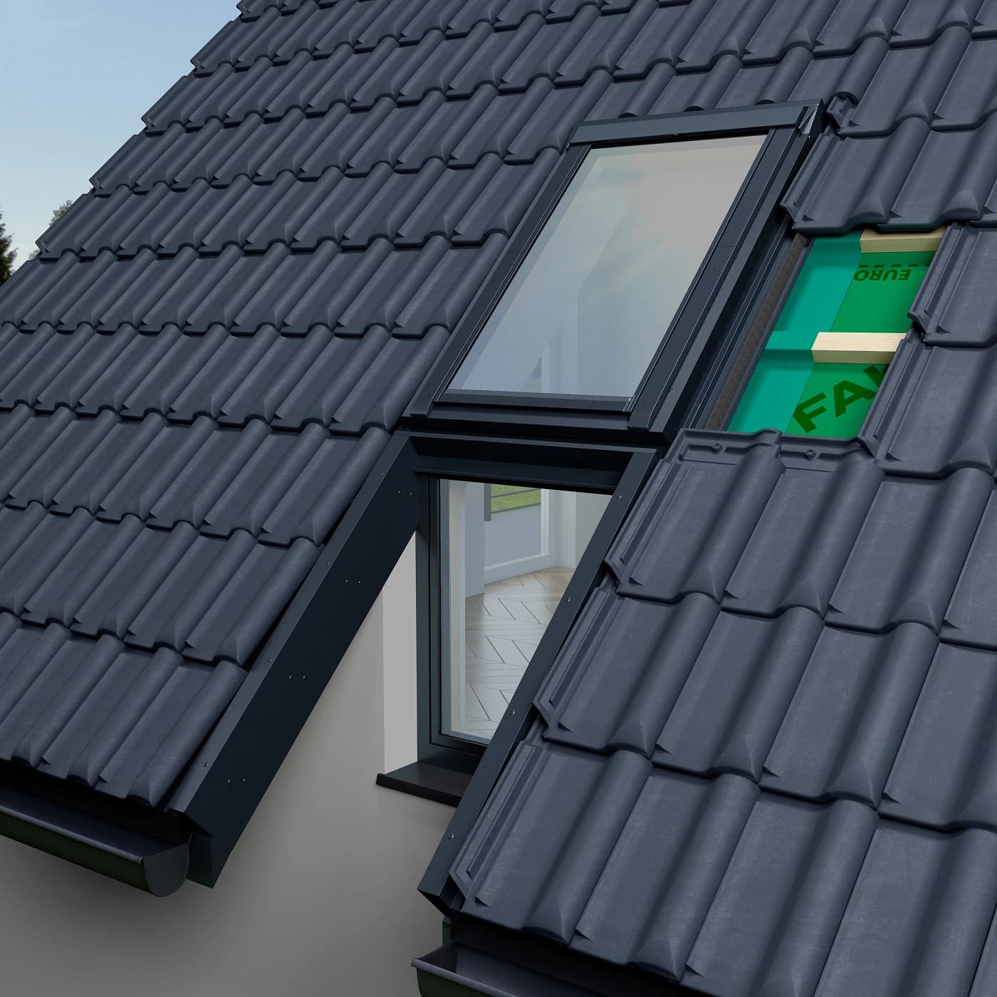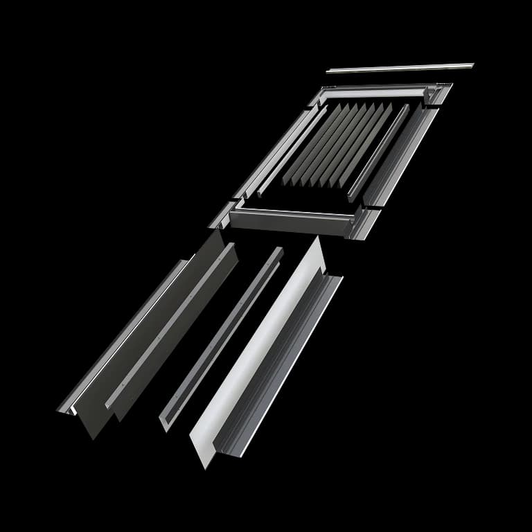 Instalacja kołnierza EUV-B _X00 przebiega wyjątkowo sprawnie, ponieważ każdy element systemu został precyzyjnie zaprojektowany tak, aby współpracował z oknem dachowym oraz kolankowym. Takie dopasowanie gwarantuje szczelne, trwałe oraz estetyczne połączenie odporne na działanie wody czy wiatru. Konstrukcja dedykowana zespoleniom kolankowym umożliwia płynne połączenie obu okien, zapewniając wysoką szczelność oraz niezawodność. Uniwersalność rozwiązania pozwala na montaż w dachach o różnych typach pokryć: płaskich, profilowanych, wysokoprofilowych. Standardowo przeznaczony do montażu pojedynczego zestawu, dostępny jest również w wersjach modułowych do zespoleń poziomych. Zakres montażu obejmuje dachy o spadku od 15° do 55°, co umożliwia szerokie zastosowanie w nowoczesnych konstrukcjach dachowych