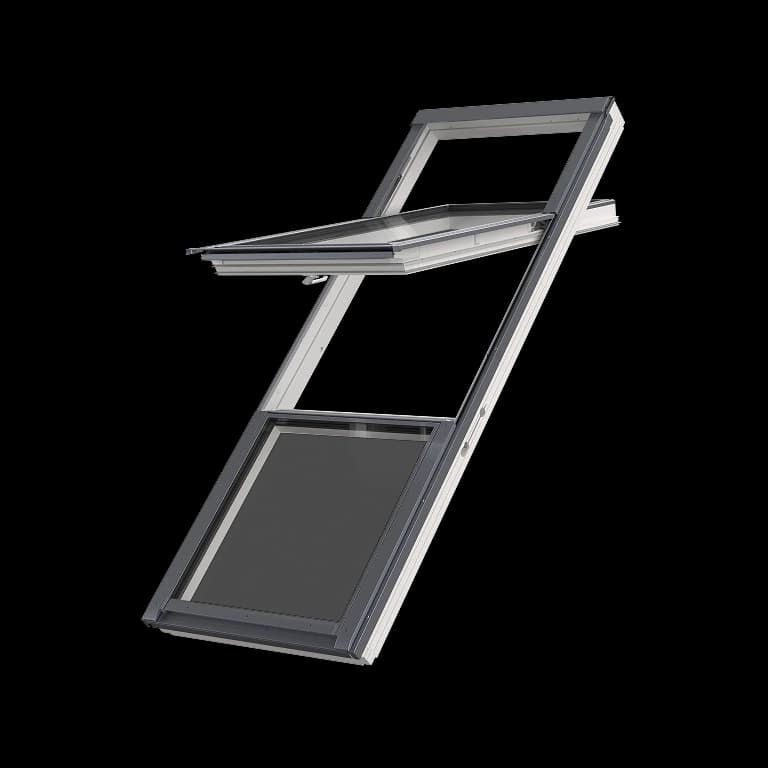 Konstrukcja obrotowa z dodatkowym naświetlem dolnym pozwala na łatwe wietrzenie i wygodną obsługę. Zawias w połowie wysokości skrzydła zapewnia płynny i stabilny ruch, a mechanizm obrotowy z systemem naprowadzania skrzydła działa płynnie, a blokada przy kącie 160° ułatwia bezpieczne mycie szyby od strony zewnętrznej. Dodatkowa szyba w dolnej części doświetla pomieszczenie, eliminując potrzebę zestawiania dwóch osobnych okien.