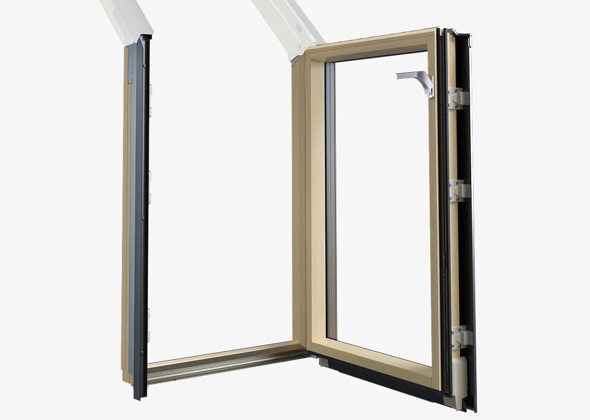 Dolne okno stanowi starannie zaprojektowany element, który maksymalizuje dopływ naturalnego światła i podkreśla nowoczesny charakter poddasza. W zależności od wersji może być otwierane na prawą lub lewą stronę, bądź też nieotwierane, pozwalając na dopasowanie zestawu do indywidualnych preferencji. Cała konstrukcja zapewnia wysoką izolacyjność termiczną i akustyczną, dzięki pakietowi szybowemu P50 oraz technologii termoPro.