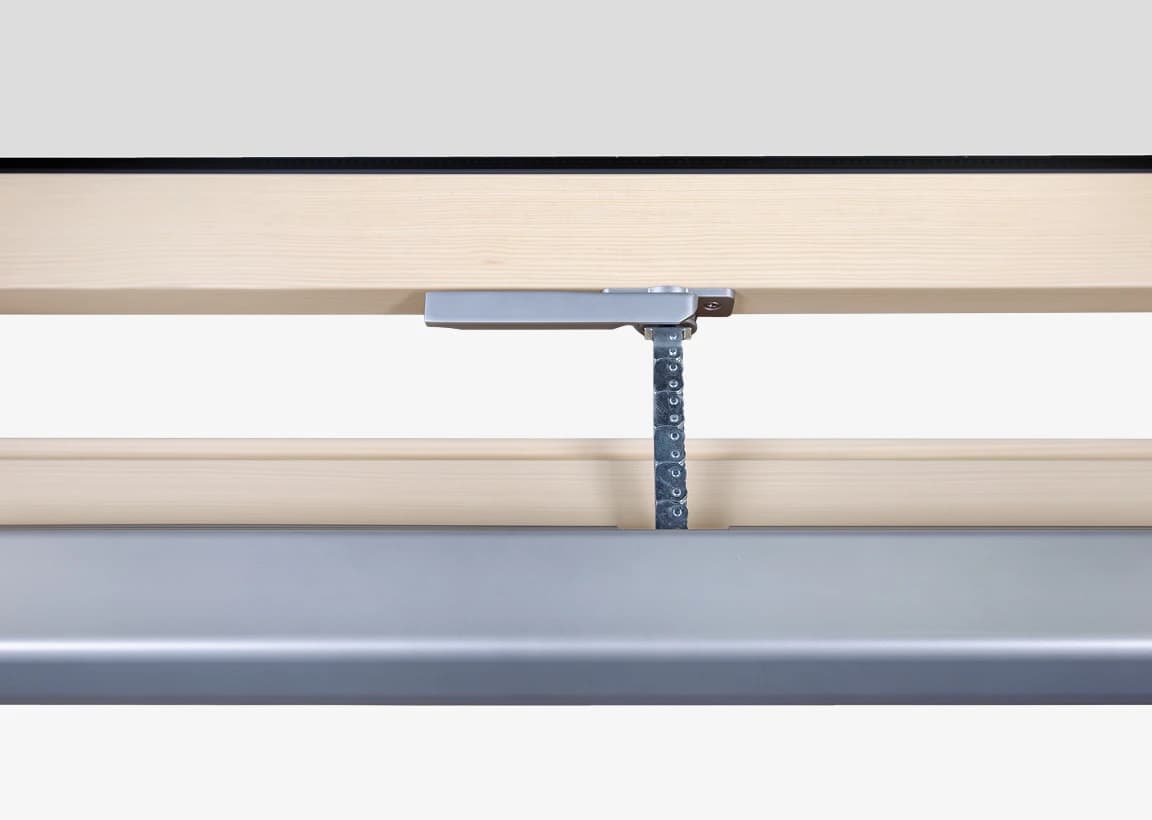 Zastosowany siłownik z wysięgiem 24 cm, umieszczony w dolnej części okna, umożliwia jego płynne i automatyczne otwieranie oraz zamykanie. Wysięgnik w formie rozwijanego łańcucha porusza skrzydłem w sposób stabilny i równomierny, zapewniając bezpieczną pracę w całym zakresie ruchu. Łańcuch wysuwa się cicho i precyzyjnie, eliminując szarpnięcia przy starcie i zatrzymaniu. Taki mechanizm pozwala na wygodne sterowanie oknem zarówno lokalnie, jak i zdalnie.