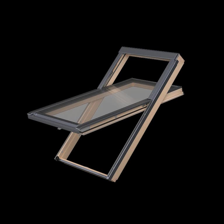 Drewno sosnowe, impregnowane próżniowo i pokryte bezbarwnym lakierem akrylowym, eksponuje naturalne usłojenie i tworzy elegancką oprawę dla wnętrz mieszkalnych. Nowoczesne oblachowanie w kolorze antracytowym (RAL 7016) podkreśla minimalistyczny charakter okna i pasuje do współczesnych dachów. Brak nawiewnika zwiększa szczelność i parametry akustyczne, dzięki czemu model ten sprawdza się w sypialniach, salonach i pokojach dziecięcych, gdzie priorytetem są cisza, bezpieczeństwo i komfort termiczny.
