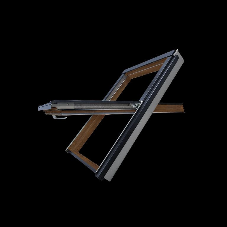 System obrotowego otwierania z zawiasem w połowie wysokości sprawia, że wietrzenie i mycie szyb jest proste i wygodne. Skrzydło porusza się płynnie i stabilnie, a precyzyjny mechanizm naprowadzający pozwala na lekkie i bezproblemowe zamykanie. Ergonomiczna klamka umożliwia intuicyjną obsługę, a blokada skrzydła w pozycji 180° pozwala bezpiecznie umyć zewnętrzną szybę od wewnątrz poddasza. To funkcjonalne rozwiązanie gwarantuje codzienny komfort użytkowania.