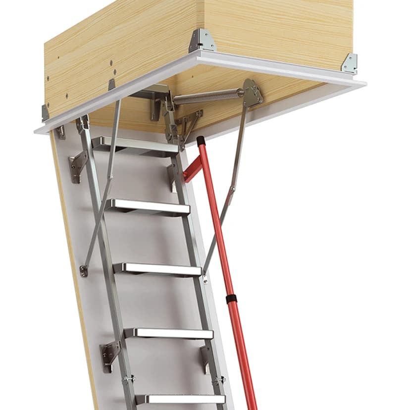 Solidna metalowa rama oraz wysoka skrzynia to kluczowe elementy, które gwarantują stabilność i trwałość schodów. W skrzyni umieszczony został także dodatkowy stopień co sprawdzi się doskonale w przypadku montażu w grubych stropach, zapewniając komfort wejścia na strych. Dodatkowo łatwa regulacja długości drabinki bez konieczności docinania sprawia, że idealnie dopasujesz schody do posiadanej wysokości pomieszczenia.