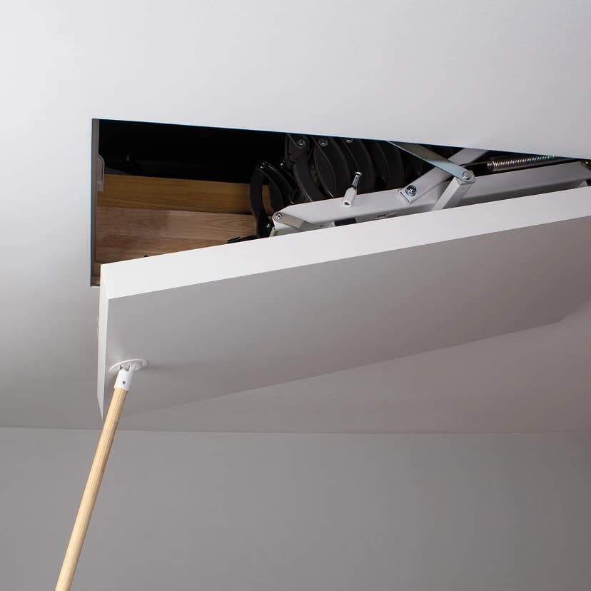 Nożycowa, metalowa drabinka została zaprojektowana z myślą o wnętrzach, w których liczy się każdy centymetr przestrzeni. Po złożeniu schody całkowicie chowają się w stropie, pozostawiając estetyczną, białą klapę. Antypoślizgowe stopnie zapewniają bezpieczne wchodzenie i schodzenie, a stopki zwiększają stabilność konstrukcji oraz chronią podłogę przed zarysowaniami. Rozkładanie przy pomocy drążka jest proste i wygodne, a drabinka wytrzymuje obciążenie do 200 kg.
