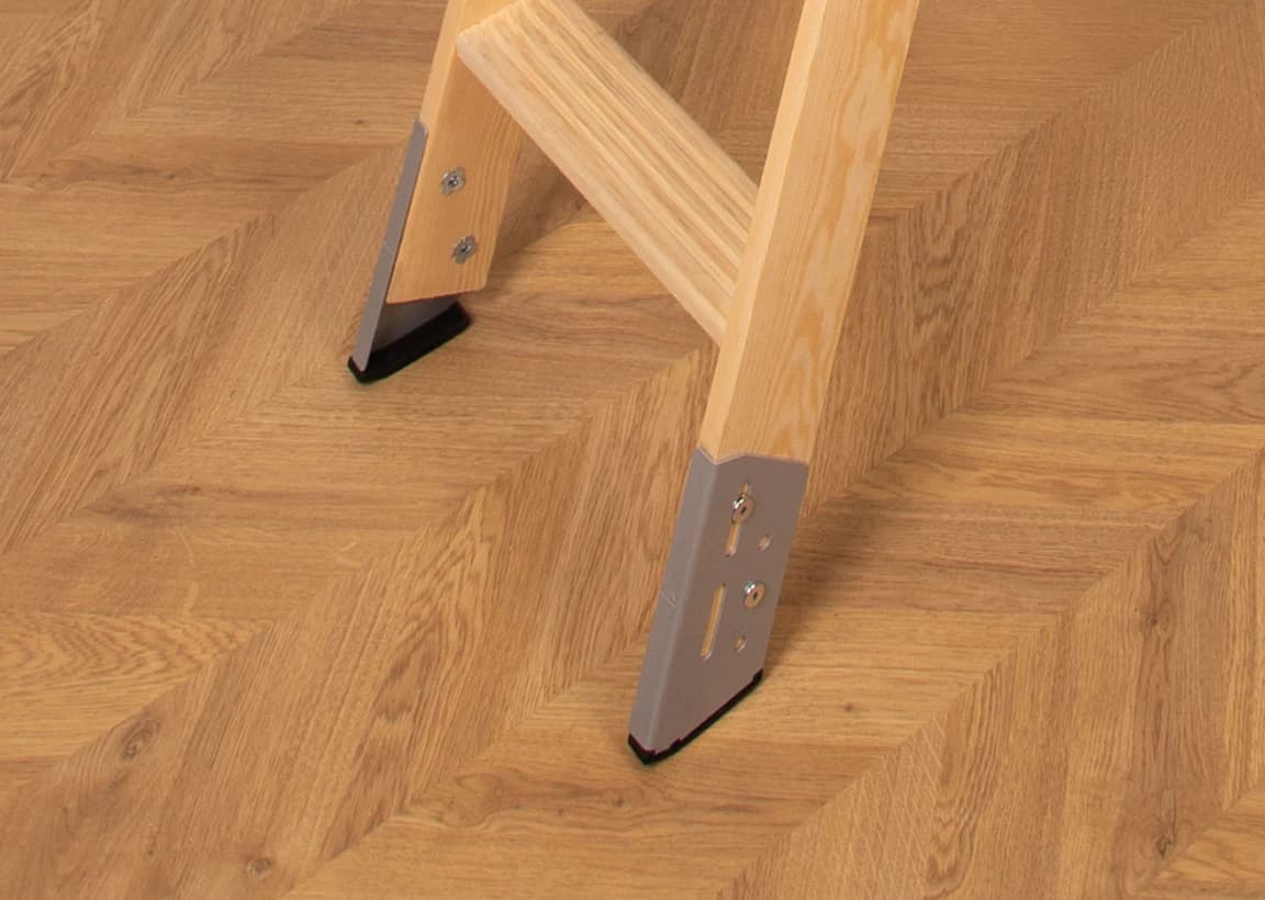 Regulowane stopki w schodach LWT Super Thermo zostały zaprojektowane z myślą o łatwym dopasowaniu do podłoża. Dzięki możliwości regulacji, można precyzyjnie dostosować ustawienie drabiny, eliminując problemy związane z nierównościami podłogi czy drobnymi błędami montażowymi. Takie rozwiązanie zapewnia stabilność całej konstrukcji, zwiększając bezpieczeństwo podczas użytkowania. Dodatkowo, stopki chronią powierzchnię podłogi przed zarysowaniami, co sprawia, że schody są nie tylko praktyczne, ale także dbają o estetykę wnętrza.
